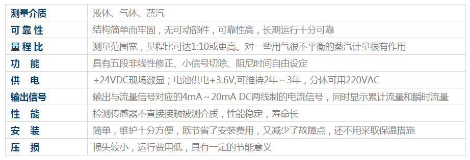 此外,渦街流量計(jì)的壓力損失小,量程范圍寬,對(duì)飽和蒸氣測(cè)量量程比可達(dá)10:1。