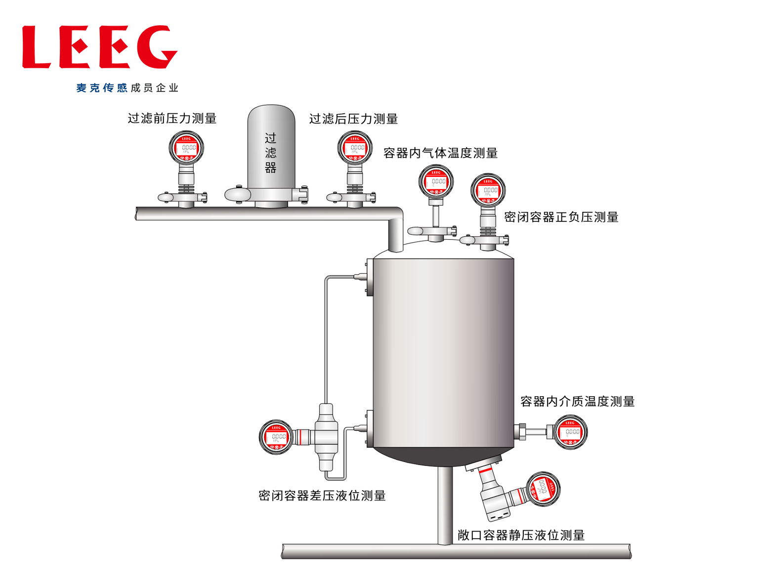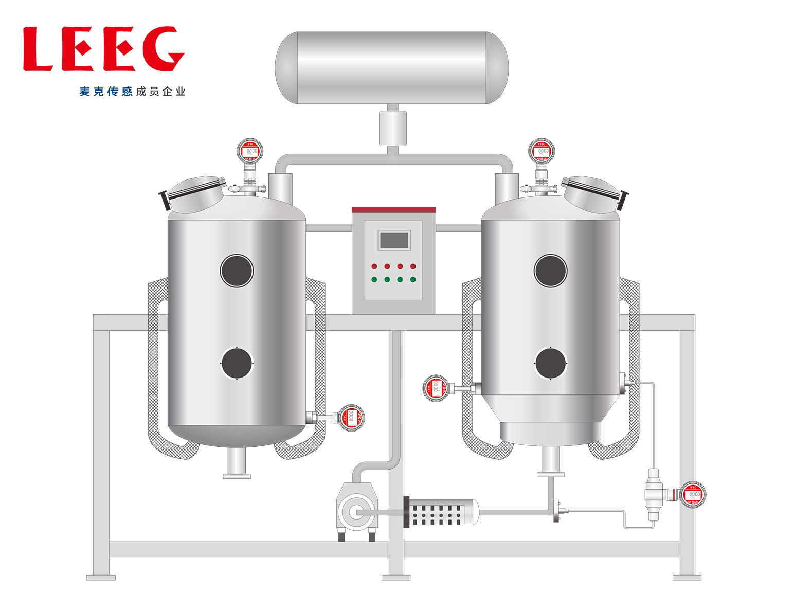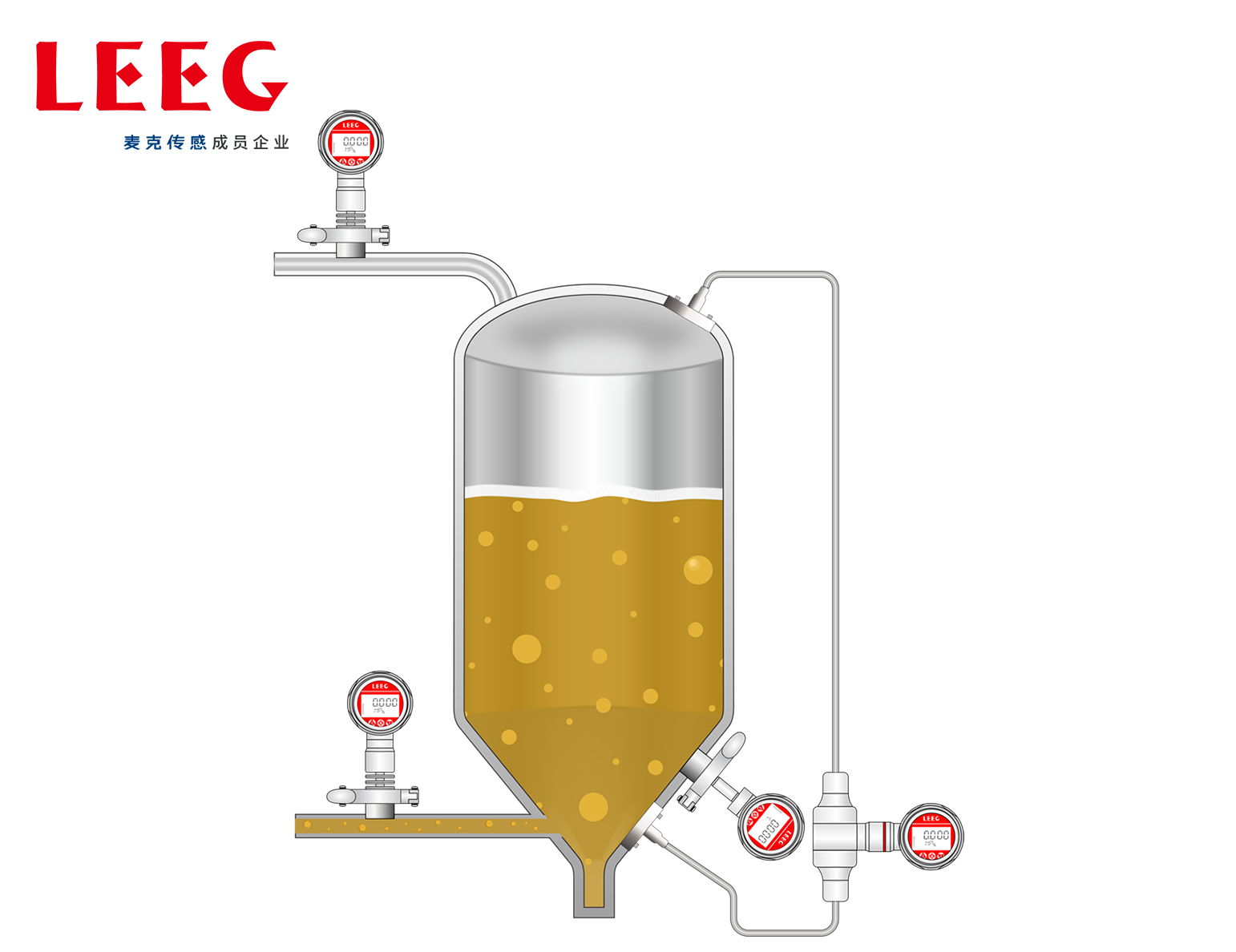 當(dāng)麥汁冷卻到適宜溫度后,加入酵母,開始發(fā)酵。在這個(gè)過程中,酵母會將溶解在麥汁中的麥芽糖轉(zhuǎn)化成二氧化碳和酒精。為了實(shí)現(xiàn)優(yōu)質(zhì)的發(fā)酵過程,需要測量發(fā)酵罐中麥汁的溫度和液位,測量回收管中的CO?和酵母管中的壓力。